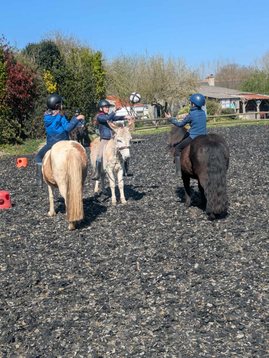 Un temps pour découvrir et soigner les animaux (poules, cochons d’Inde, chèvres, brebis…) puis découverte des activités avec le poney : voltige, jeux avec les poneys, balade.